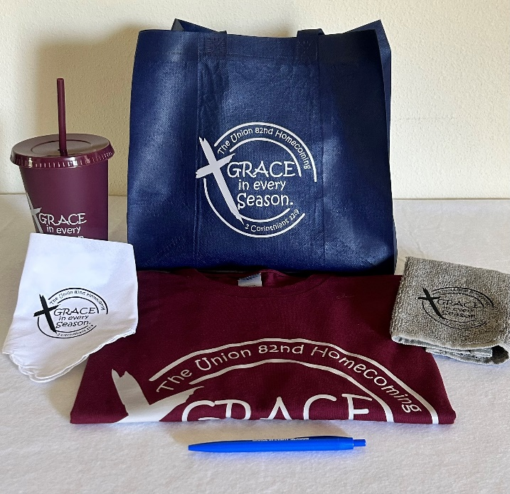 Includes: Tote Bag (Select Color), T-Shirt (Select Color), Tumbler, Pen, and a White Handkerchief or Gray Small Towel. All items are printed with our 82nd Anniversary theme, ”Grace in Every Season”